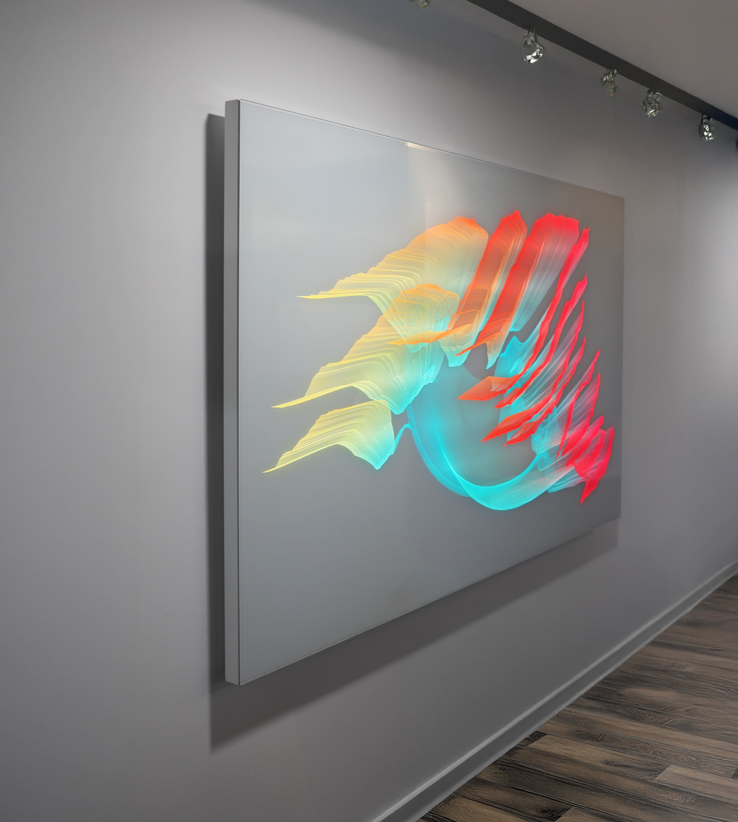 Die Light Wave-Skulpturen sind ultraflache Leuchtkästen, die auf der Grundlage konkreter Datensätze aus Naturphänomenen, Mustern oder sozialen Bewegungen entstehen. Sie machen das Unsichtbare sichtbar und übersetzen Daten in visuelle Lichtwellen – Informationen verwandeln sich in ein dynamisches, farbiges und poetisches Erlebnis.