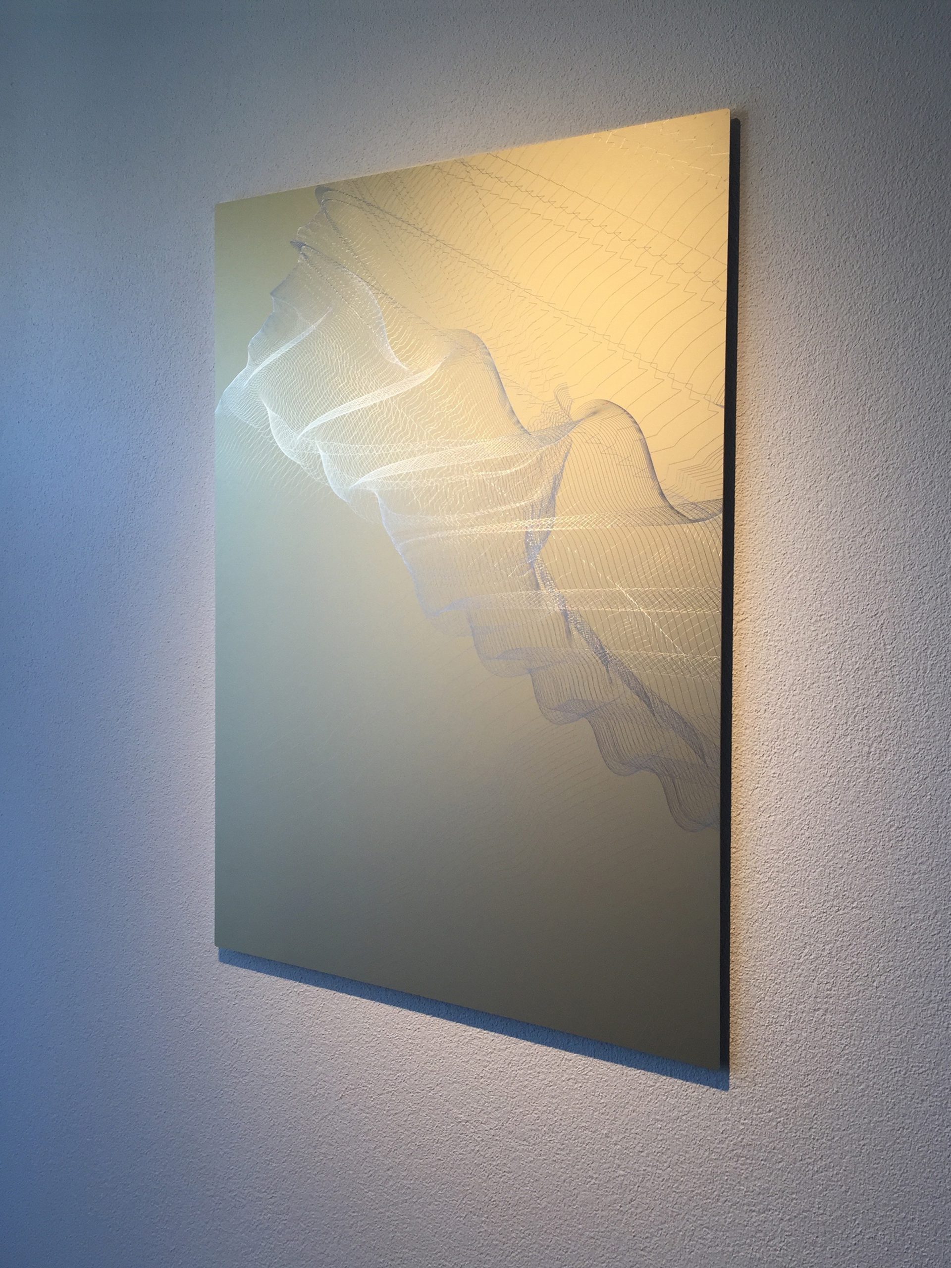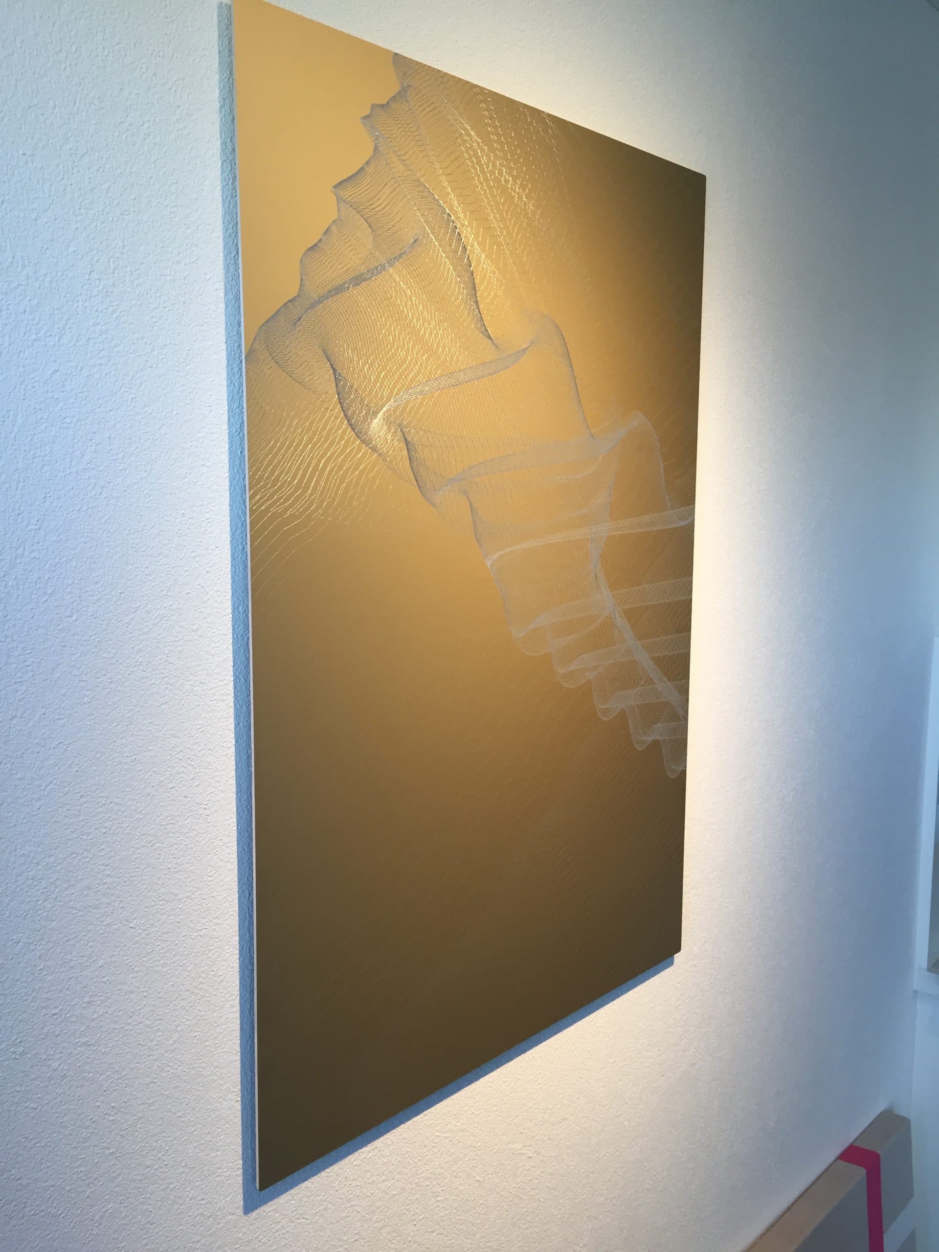 Das fertige Objekt, das manuell und mit Iteration und Algorithmen erstellt wird, wird dabei mit einem Diamanten in das Eloxal geritzt. So entsteht ein bestimmter Brechungswinkel der das Objekt schimmern lässt, manchmal dunkel manchmal hell erscheinen lässt. Form und Inhalt verschmelzen im Licht. Die Objekte sind in 1) schwarz/silber, 2) gold/silber und 3) silber/silber erhältlich.